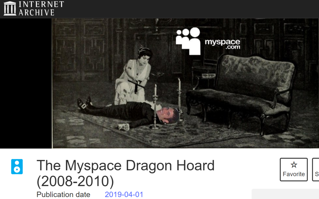 In April of 2019, the Internet Archive recovered 490,000 MP3s from the lost MySpace servers. They had been collected using unknown means by an anonymous academic study conducted between 2008 and 2010. The collection, referred to as the “MySpace Dragon Hoard,” is likely the closest we will ever get to experiencing what was lost. Despite being a cumulative total of 1.3 terabytes, it accounts for less than 0.1% of the destroyed MP3s.